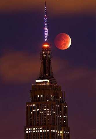 此次月全食在亞洲(除西南部)、印度洋東部、北冰洋、太平洋、南極洲極小部分、北美(除極東北部)、南美洲西部、大西洋西部都可以看到。圖為美國帝國大廈附近拍到的月全食紅月亮.